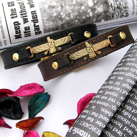 دستبند چرمی طرح فروهر با دو رنگ قهوه‌ای و مشکی و پلاک نازک طلایی فروهر نمونه‌ای از زیورهای ساده و در عین حال پرطرفدار از جانب آقایان و خانوم ها است که با اکثر رنگ‌های لباس همخوانی داشته و در عین حال متفاوت دیده می‌شود. این دستبندها مناسب ترین هدیه برای جوانان شیک پوش است.