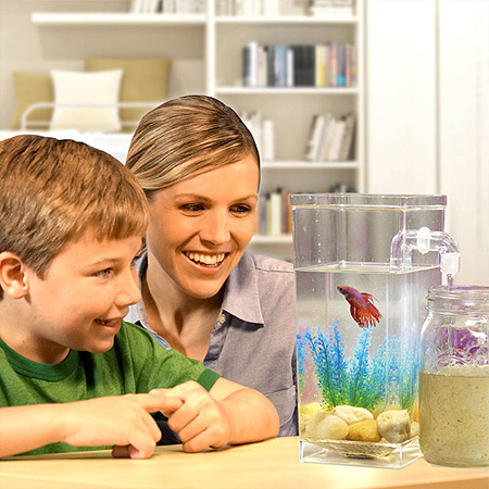 آکواریوم جادویی خانگی به شکل یک گلدان مربعی بوده که دارای لوله ی تمیز کننده است و شما فقط کافیست که آب تمیز را داخل آکواریوم جادویی ریخته و شاهد خارج شدن آب کثیف از لوله ی تمیز کننده ( cleaning tank) بوده و از بوی نامطبوع اکواریم ها جلوگیری کنید در عین حال که زیبایی یک آکواریوم بزرگ را دارا بوده و به خصوص برای بچها ( که از نگهداری موجودات آبی لذت میبرند ) بسیار جالب است.