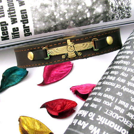 دستبند چرمی طرح فروهر با دو رنگ قهوه‌ای و مشکی و پلاک نازک طلایی فروهر نمونه‌ای از زیورهای ساده و در عین حال پرطرفدار از جانب آقایان و خانوم ها است که با اکثر رنگ‌های لباس همخوانی داشته و در عین حال متفاوت دیده می‌شود. این دستبندها مناسب ترین هدیه برای جوانان شیک پوش است.